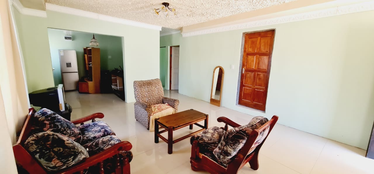 Inside, the home presents a fresh and clean aesthetic with freshly painted light green walls and modern tiled flooring throughout the living areas. It comprises a comfortable lounge, a dedicated dining room, and a functional kitchen, providing a practical layout for daily living and entertaining.