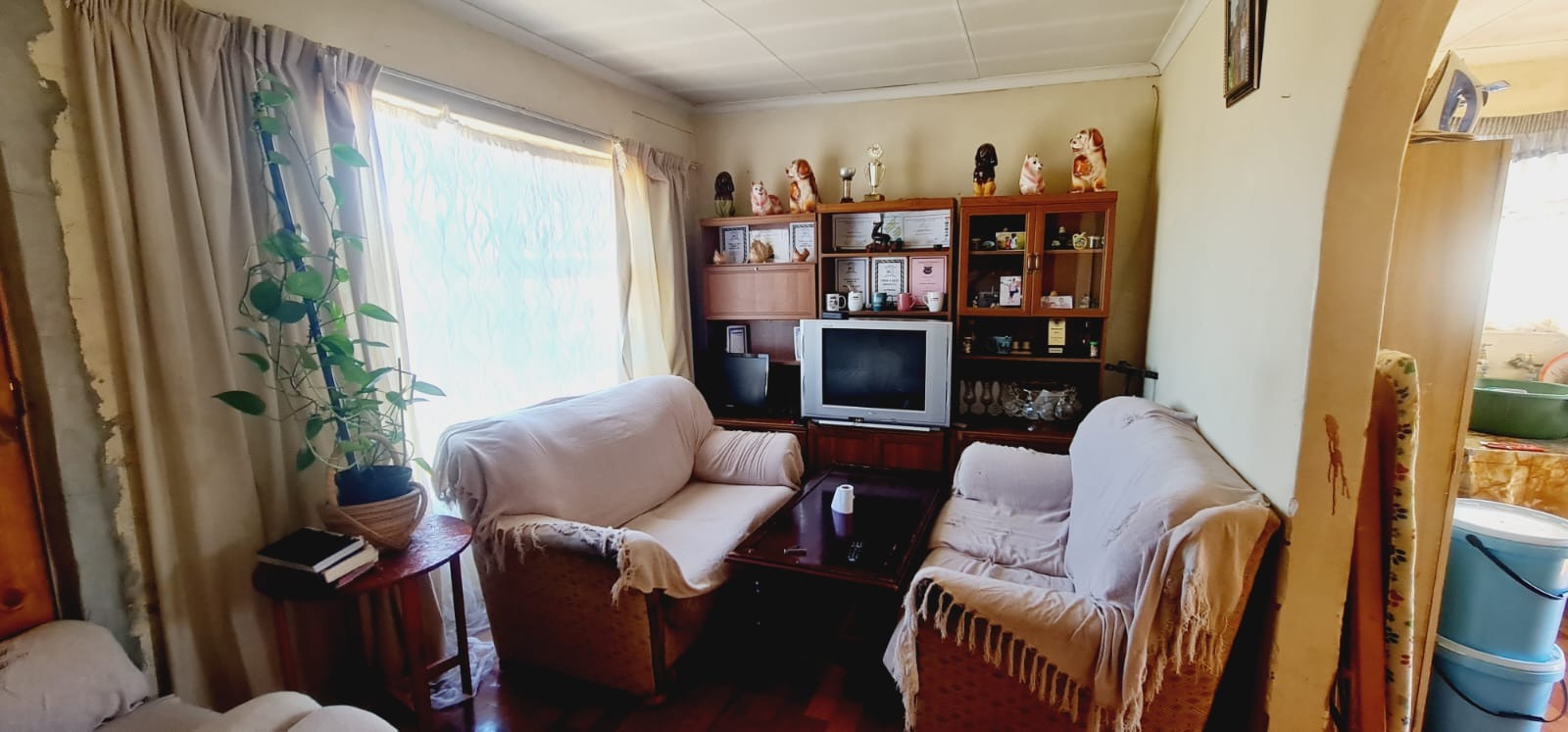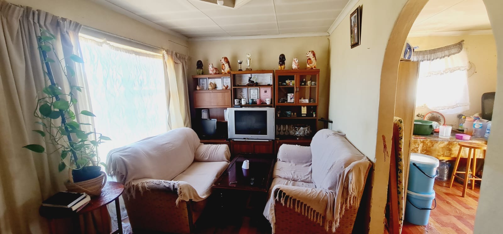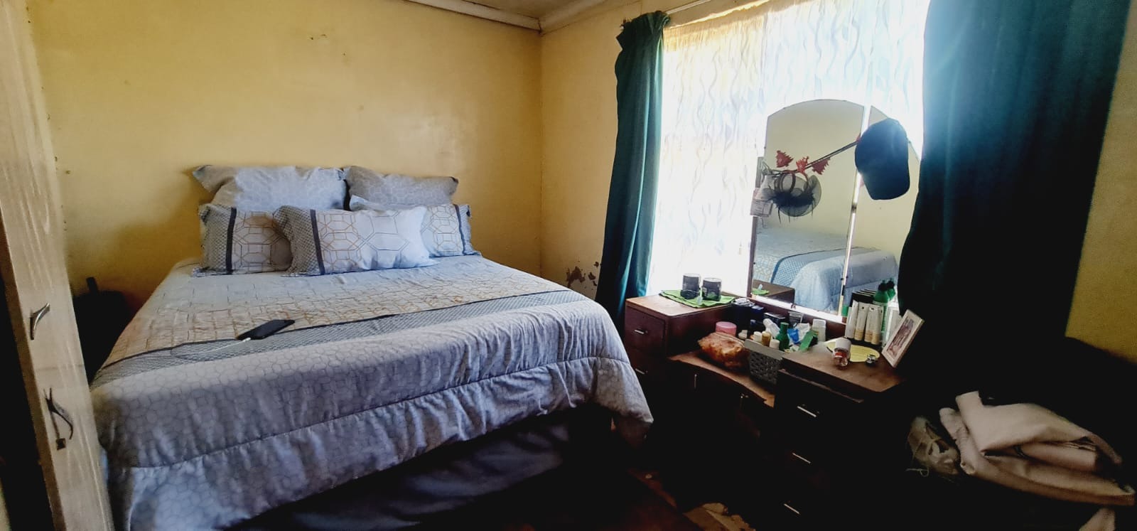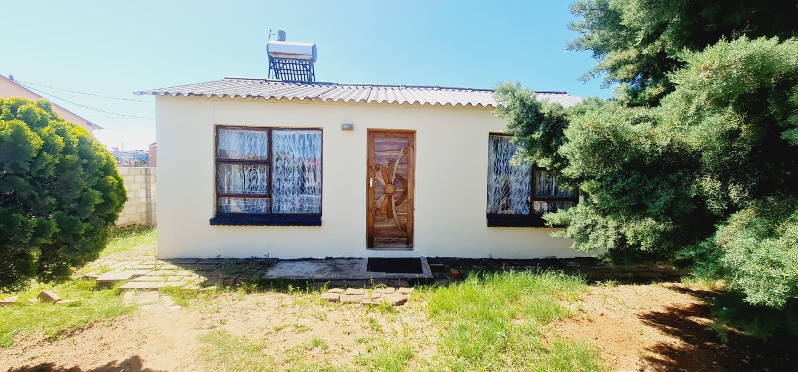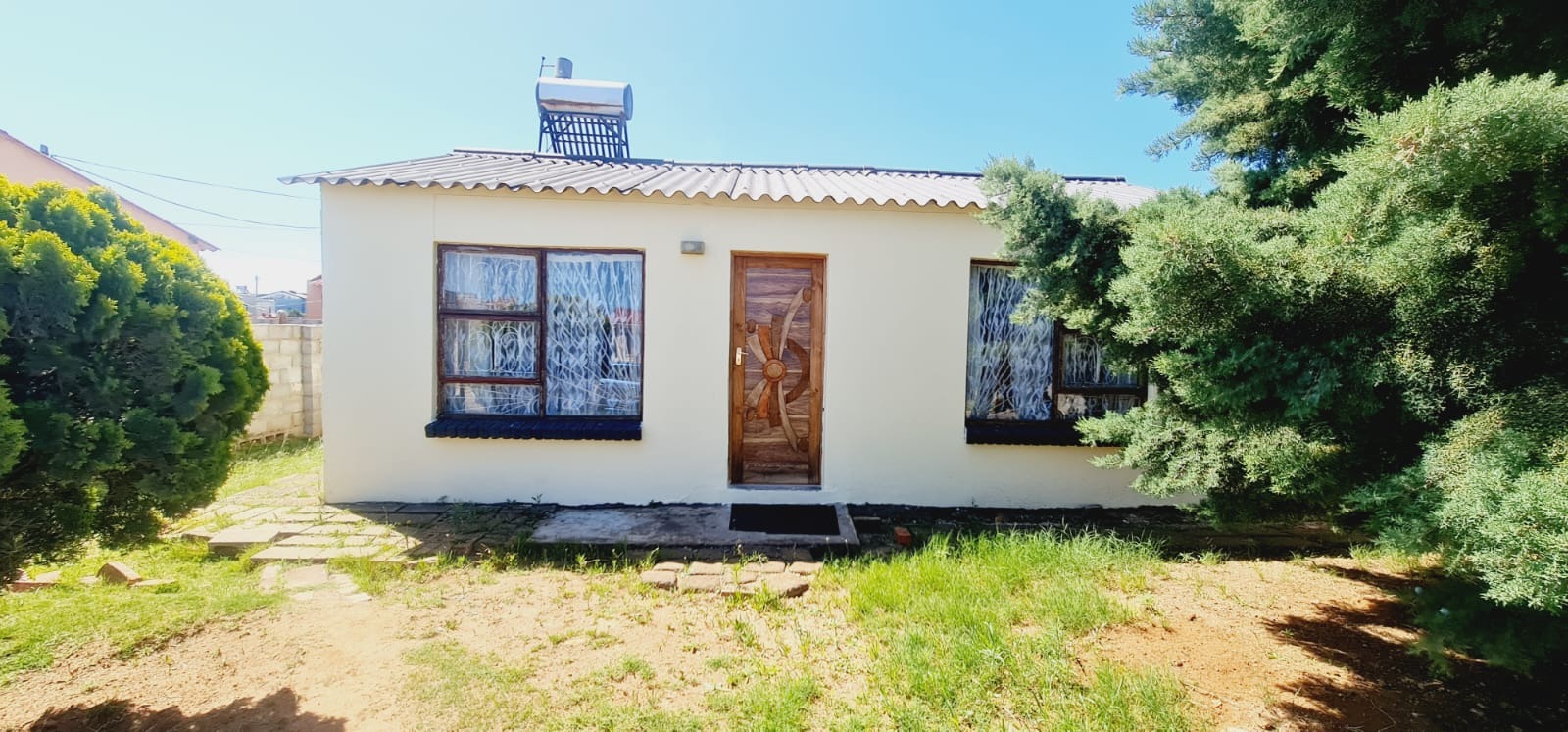 2-bedroom, 1-bathroom home, where a distinctive wooden front door welcomes you. The exterior boasts fresh paint and a practical rooftop solar water heater, helping you save on energy bills. While the front yard is a blank canvas, mature trees offer lovely natural shade, and security bars on the windows provide peace of mind.