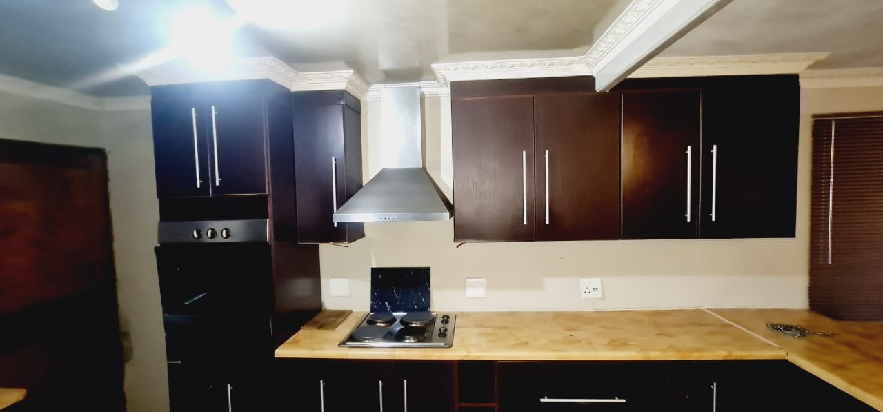 Fully fitted kitchen with built-in cupboards, stove, oven, and hob all intact and tiled