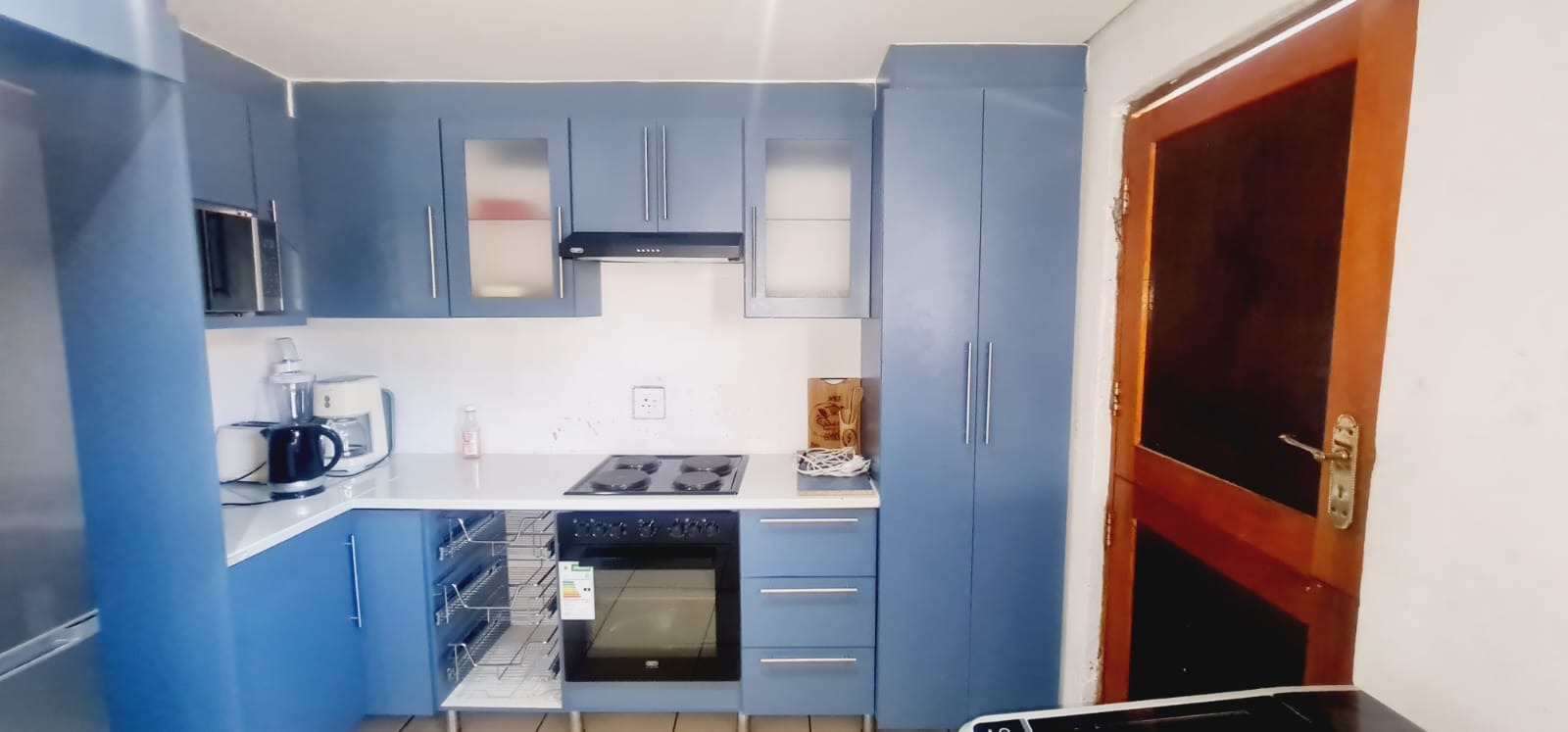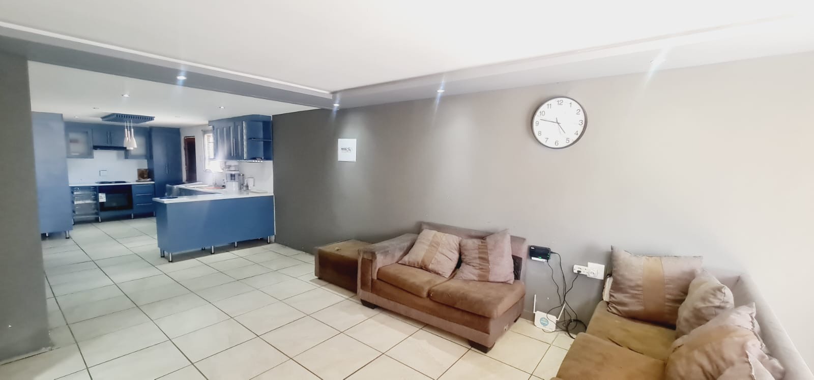 This open-plan living area flows seamlessly into a modern kitchen. This kitchen is a real standout with its distinctive blue cabinetry, sleek white countertops, and ample storage, including a built-in oven and hob. The living room is a beautiful spot, featuring a stylish built-in media unit with accent lighting and contemporary recessed ceiling lights, perfect for relaxing or entertaining.