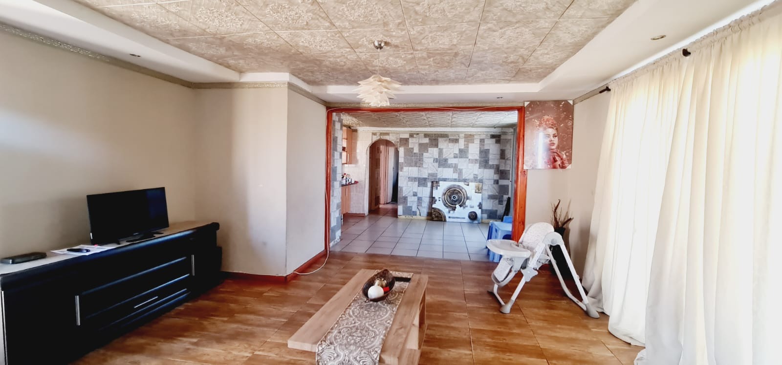 Inside, you'll find a practical layout with tiled flooring throughout, making it easy to maintain. The open-plan living and kitchen area is bright and airy, perfect for everyday life. The kitchen features wood-toned cabinets and dark countertops, ready for your culinary adventures. There are two comfortable lounge areas, one even boasting a fireplace, offering plenty of space for relaxation and entertaining. The decorative ceiling panels add a touch of charm, though you might want to update them to match your style.