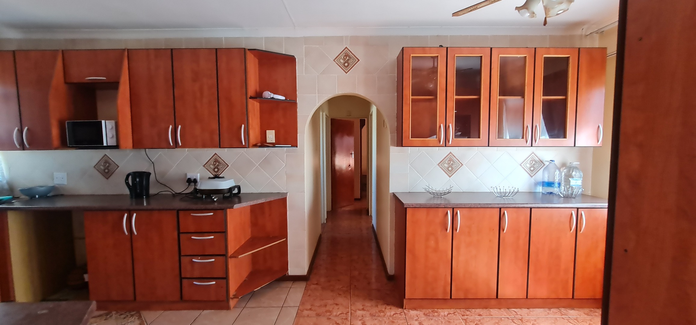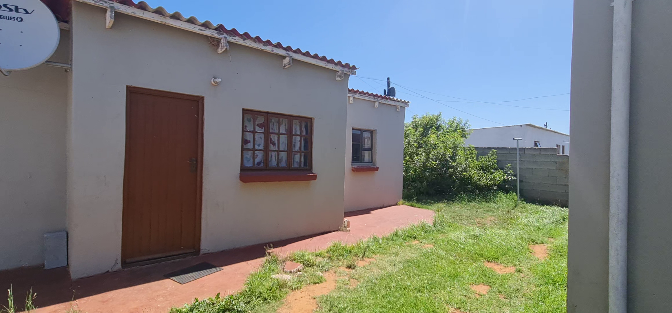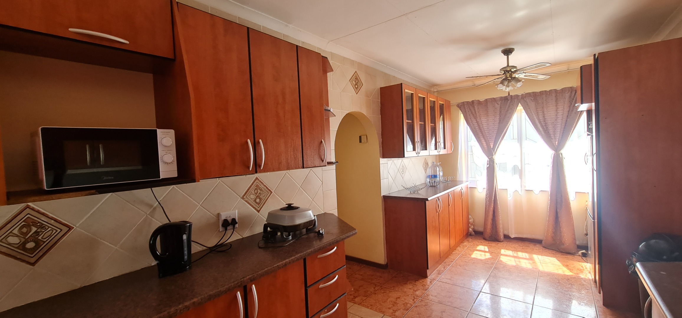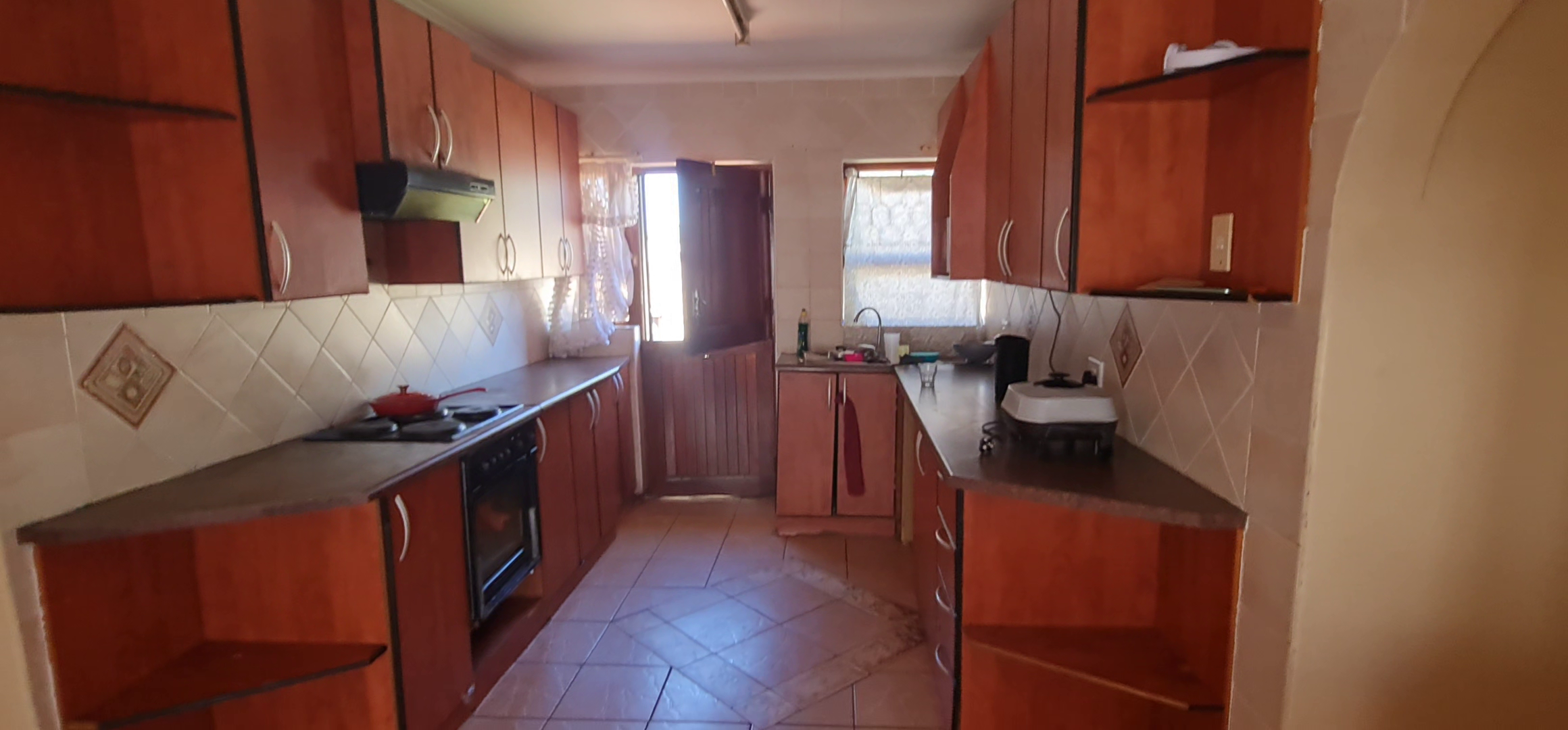 This well-enclosed family home features three bedrooms, each equipped with built-in cabinets, including a main bedroom with an ensuite. The spacious double living area boasts tiled floors, while the generous kitchen comes with built-in cabinets and a hob system.