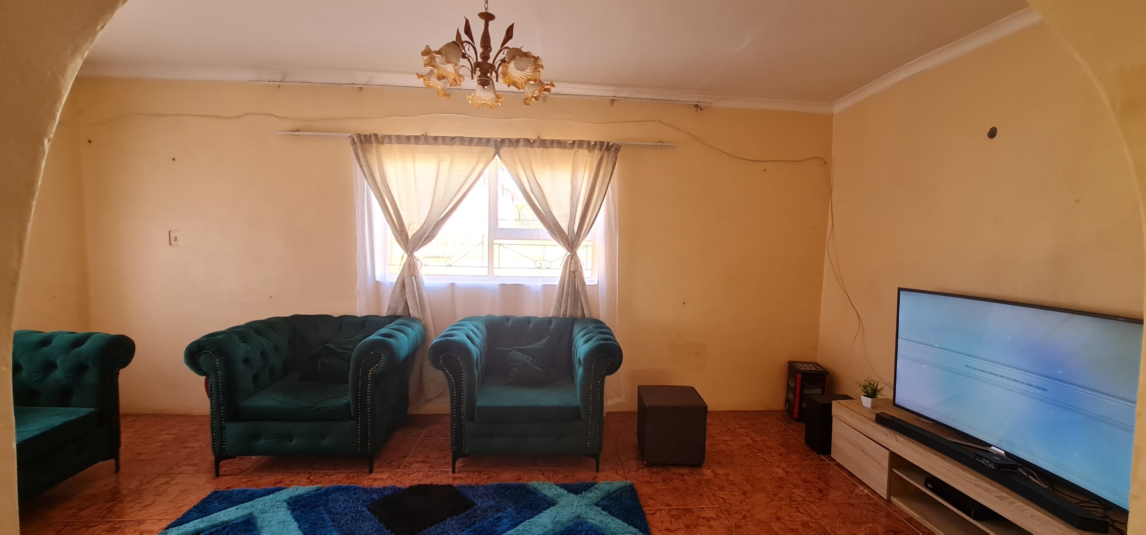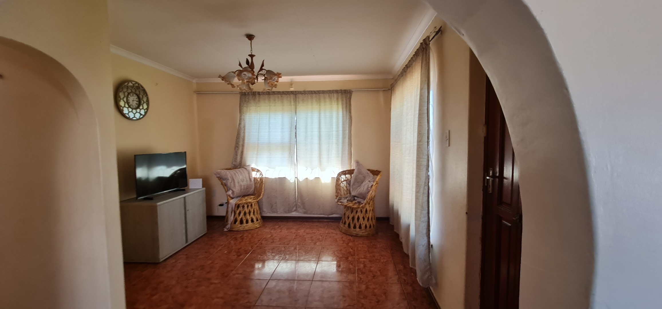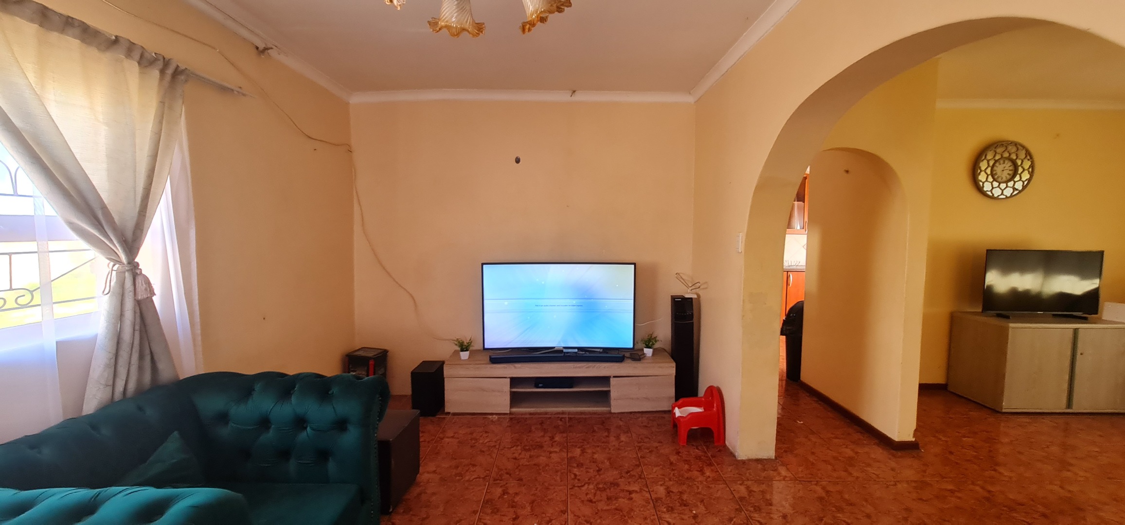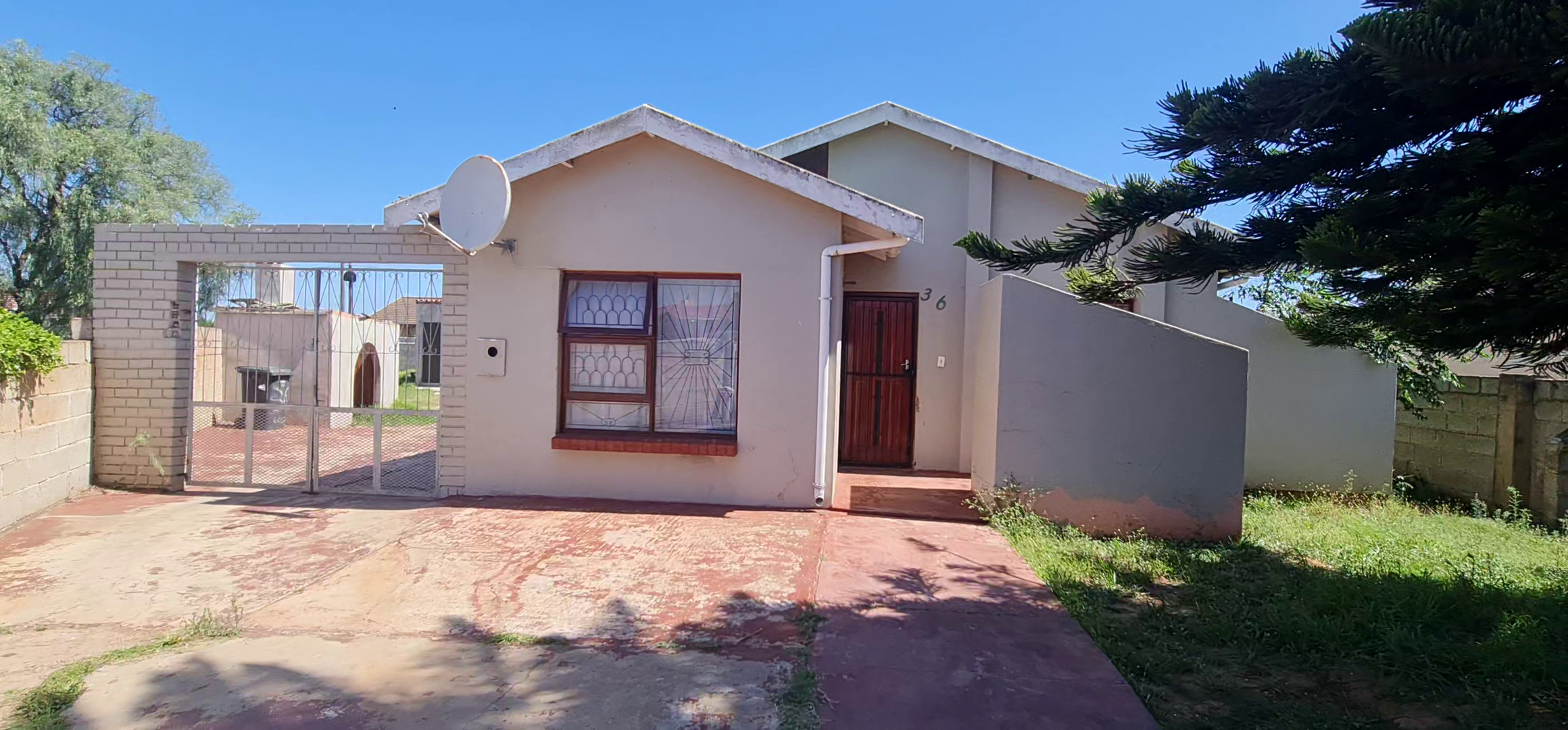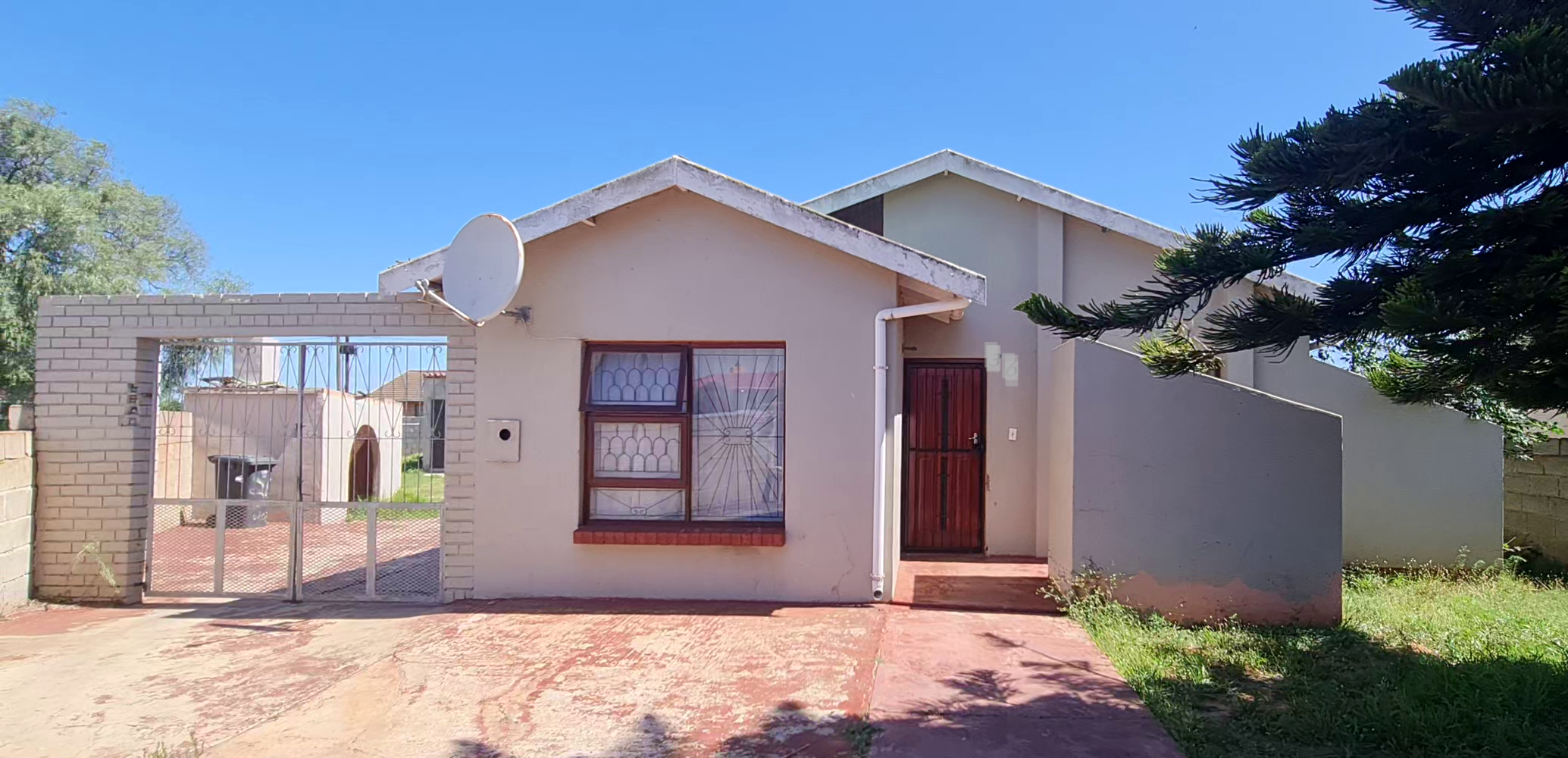 This well-enclosed family home features three bedrooms, each equipped with built-in cabinets, including a main bedroom with an ensuite. The spacious double living area boasts tiled floors, while the generous kitchen comes with built-in cabinets and a hob system.