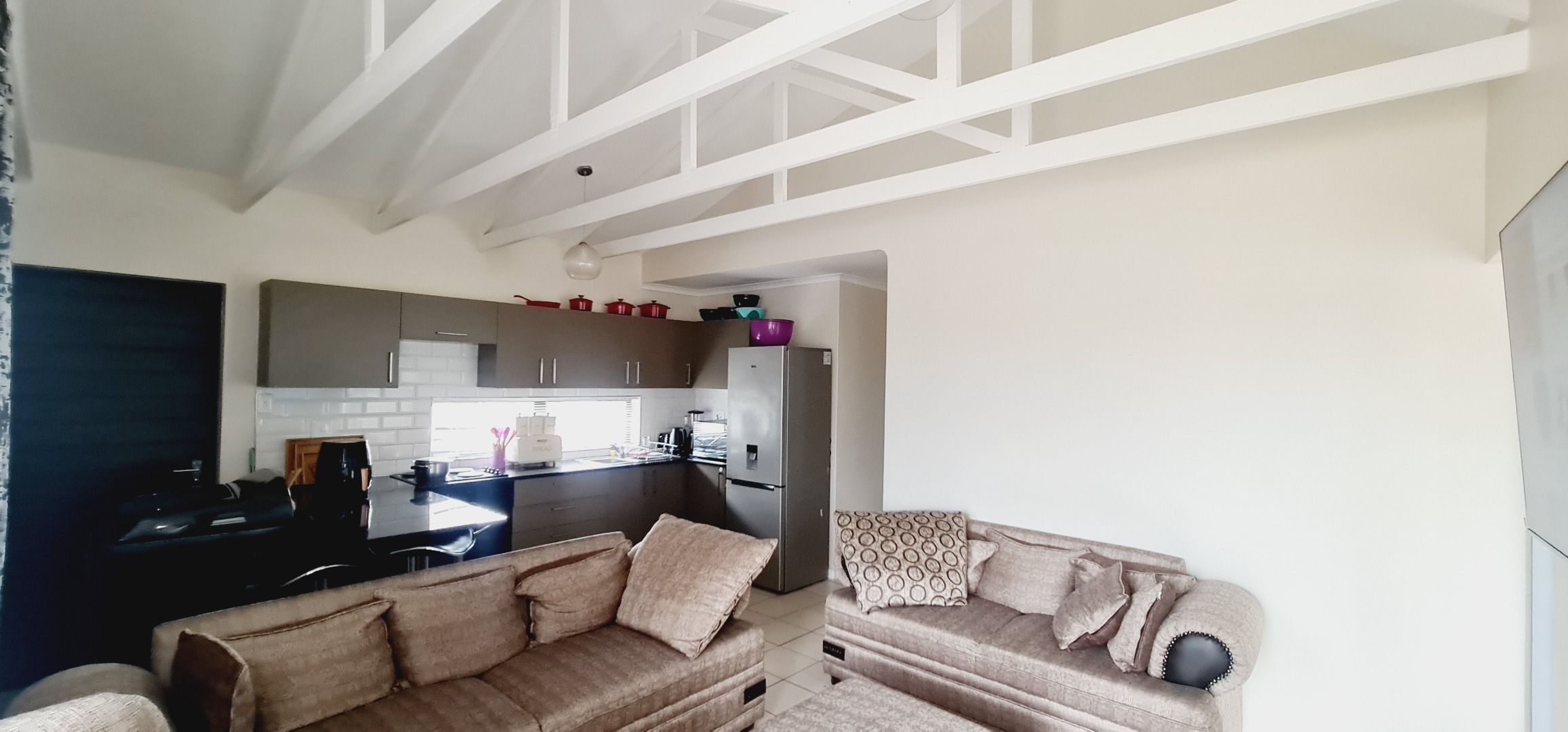 * Exposed white ceiling beams