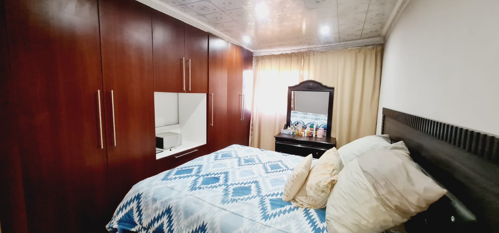This home features two comfy bedrooms, each offering a peaceful retreat. You'll love the ample storage provided by the built-in dark wooden wardrobes, which even include a handy integrated niche. A neat bathroom serves the home, ensuring convenience for everyone.