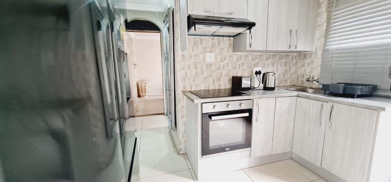 Meal prep is a breeze in the modern kitchen, which boasts light wood-grain cabinetry, offering plenty of storage for all your essentials. You'll love the built-in oven, hob, and extractor fan, plus there's space for a large double-door refrigerator. The mirrored backsplash adds a touch of contemporary flair and makes the space feel even bigger.