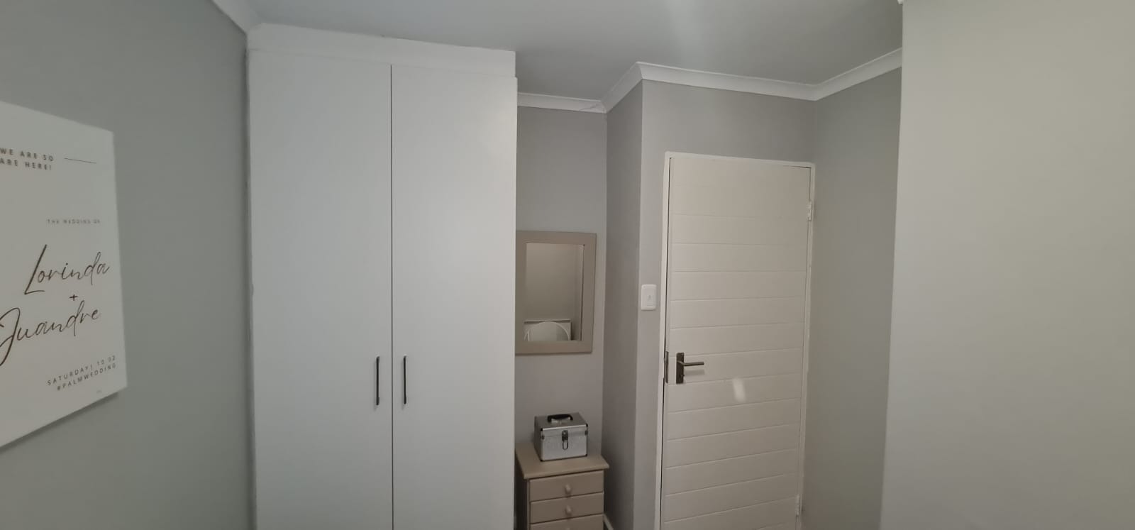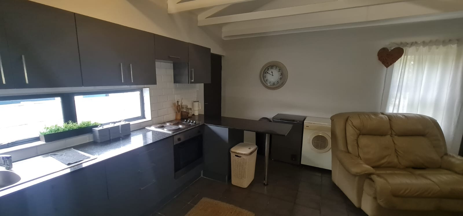 The home includes 1 bathroom with a built-in mirror and a toilet, designed with functionality in mind. The open-plan living area flows seamlessly into the kitchen, which comes fitted with built-in cupboards – perfect for modern family living or entertaining guests.